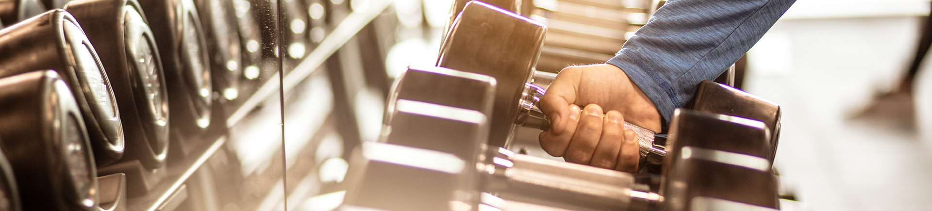 A man clutching a dumbbell in a gym which has specific fitness insurance to ensure accidents do not harm the business and can support customers if anything does happen.
