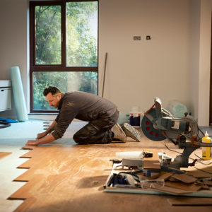 A tradesman carefully fits wooden flooring while he is covered for personal accident and liability under his tradesman insurance policy.