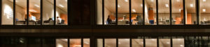 A long shot of offices in the evening as commercial businesses within work into the night, many of which have commercial insurance with Leniston Insurance Brokers.